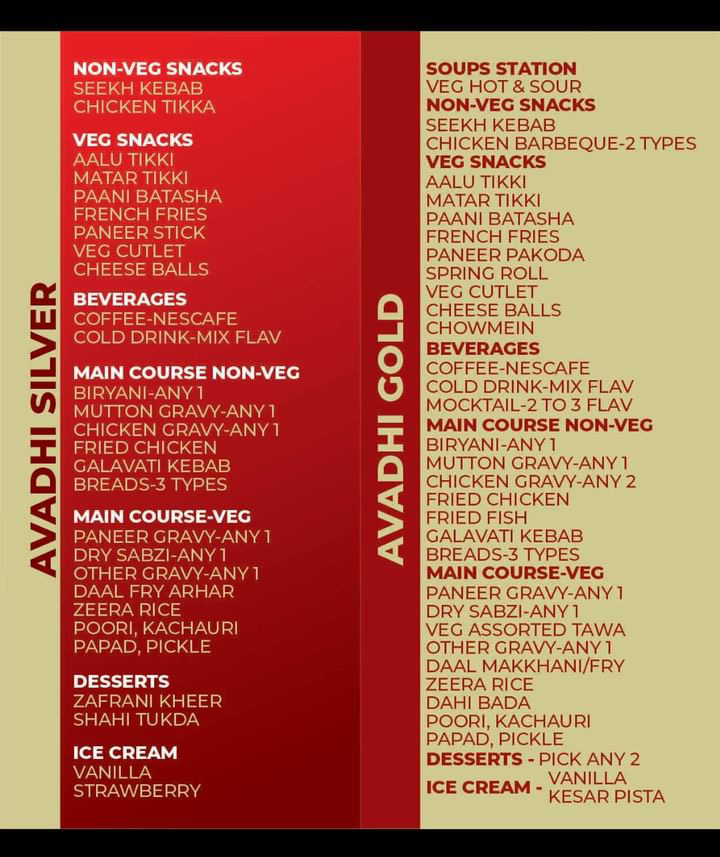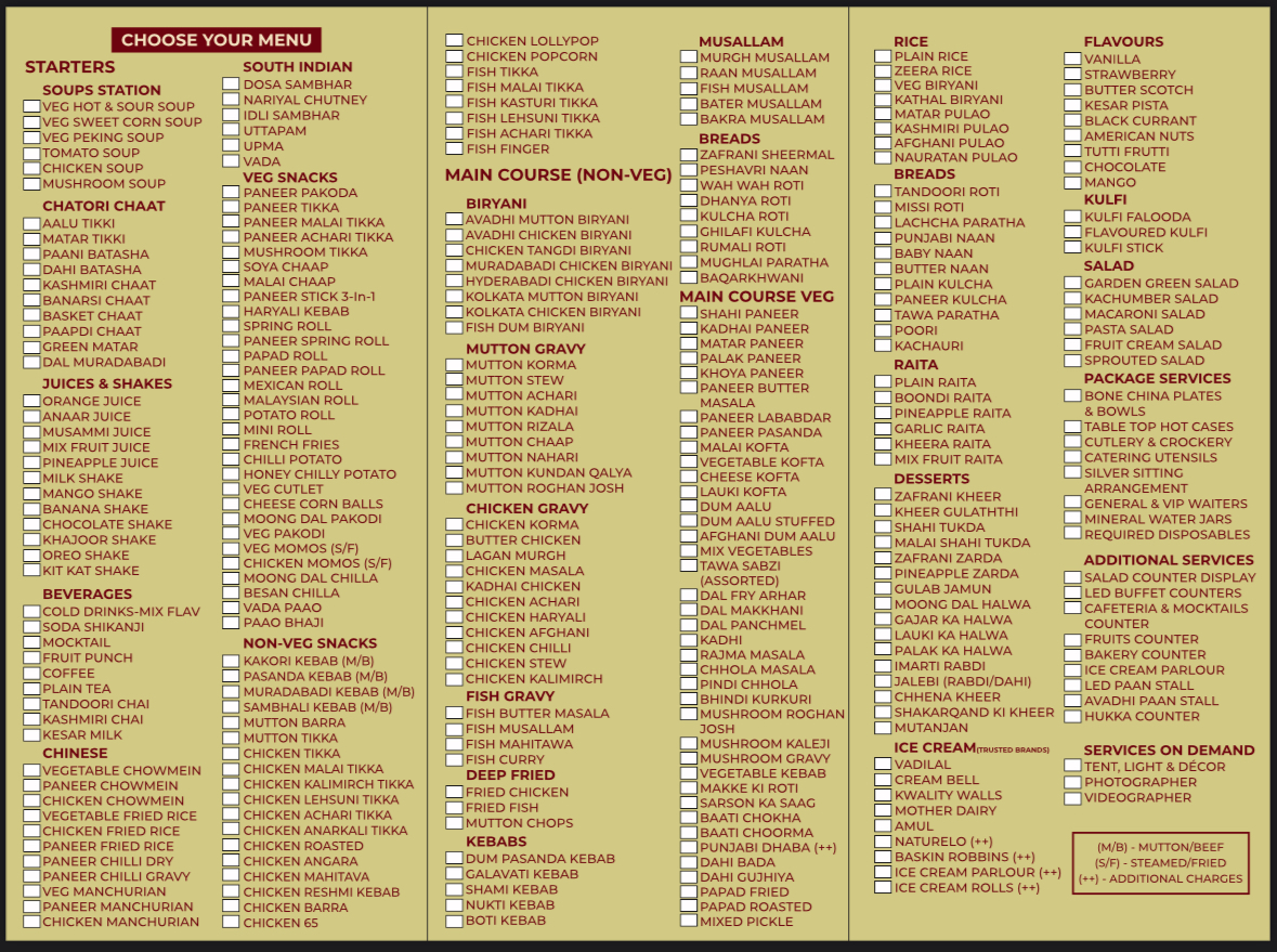 Select the required items of your choice from starters to main course, beverages and desserts & make your own menu.